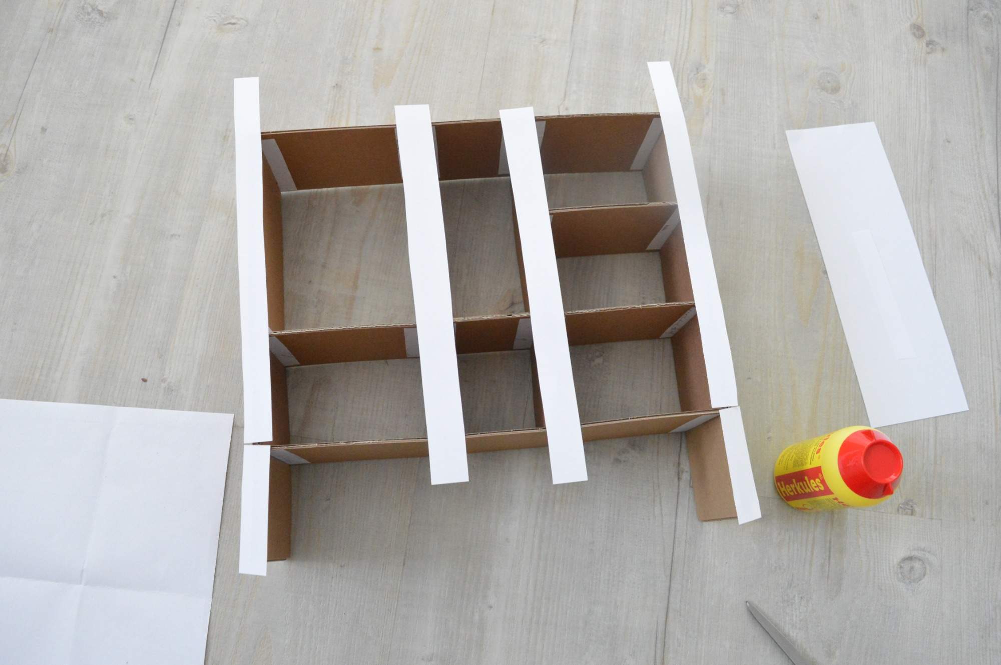 A následovalo nalepení kratkých svislých kusů na horní poličku a dovyztužení všech zbyvajících částí.