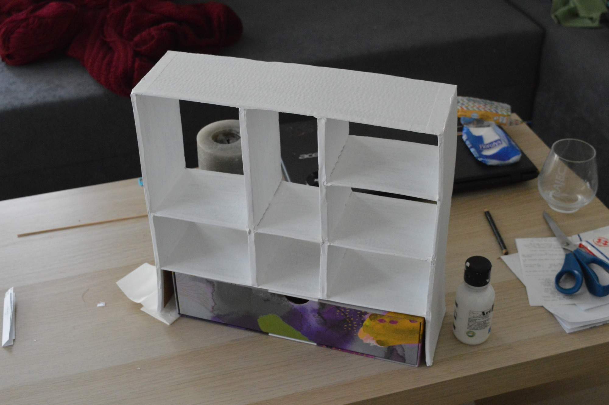 První šla na řadu spodní polička, kde jsem jí nejprve přilepila k jednomu bočnímu dílu zvrchu i zespodu. A pak na spodní část rovnou připlácla "výztuhu".